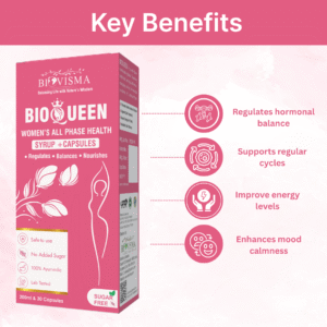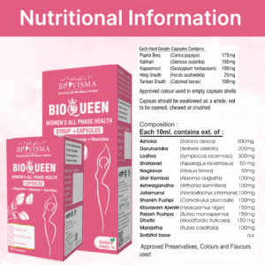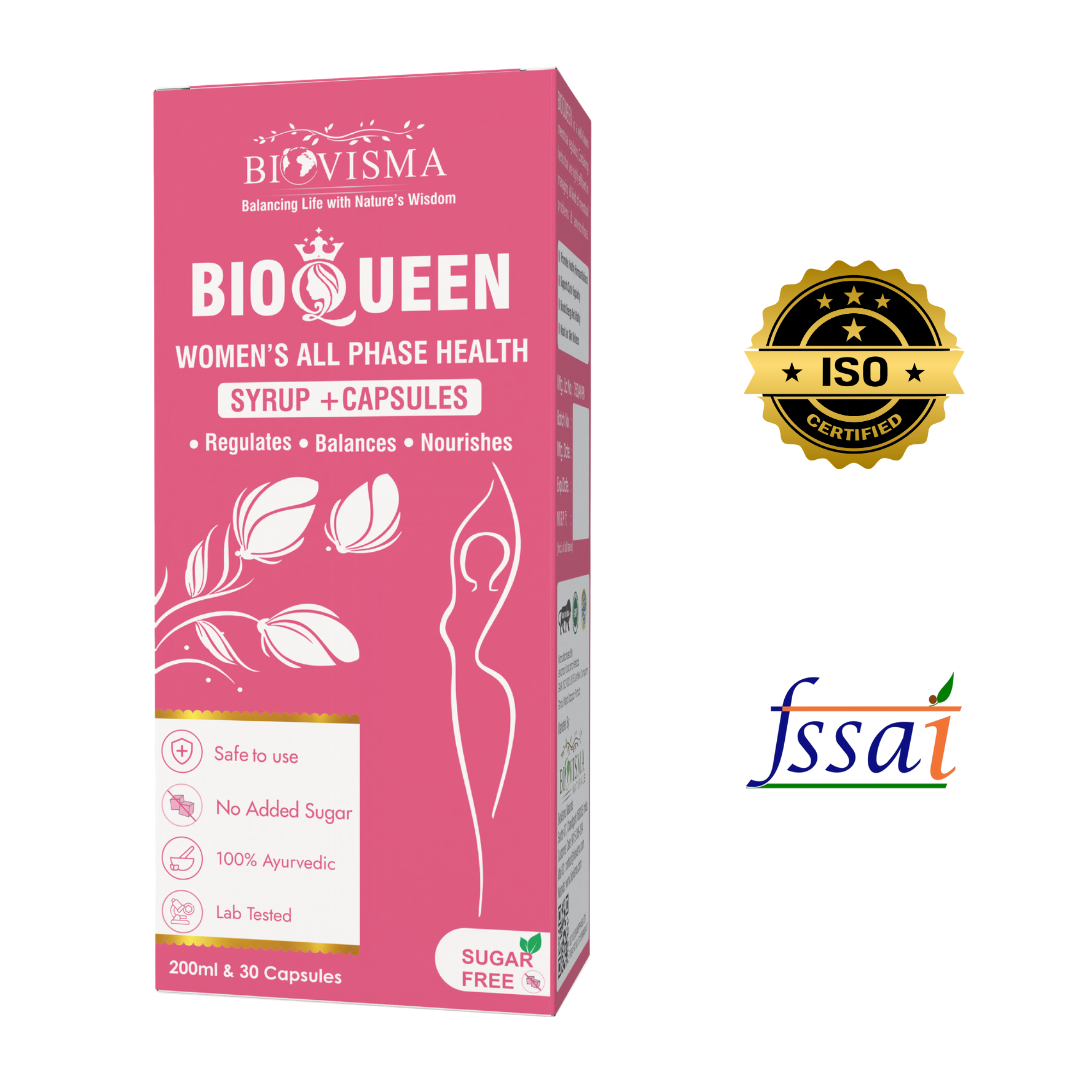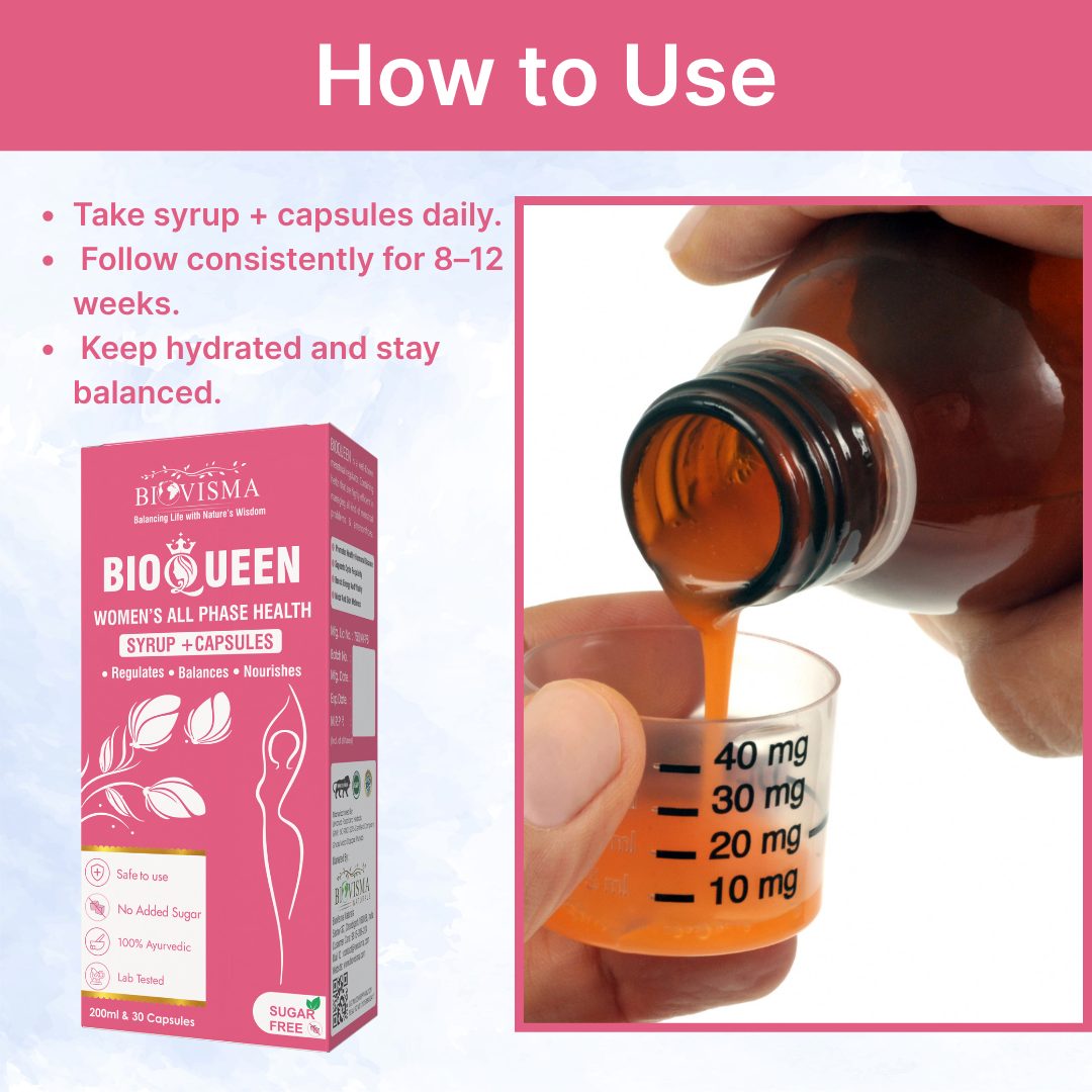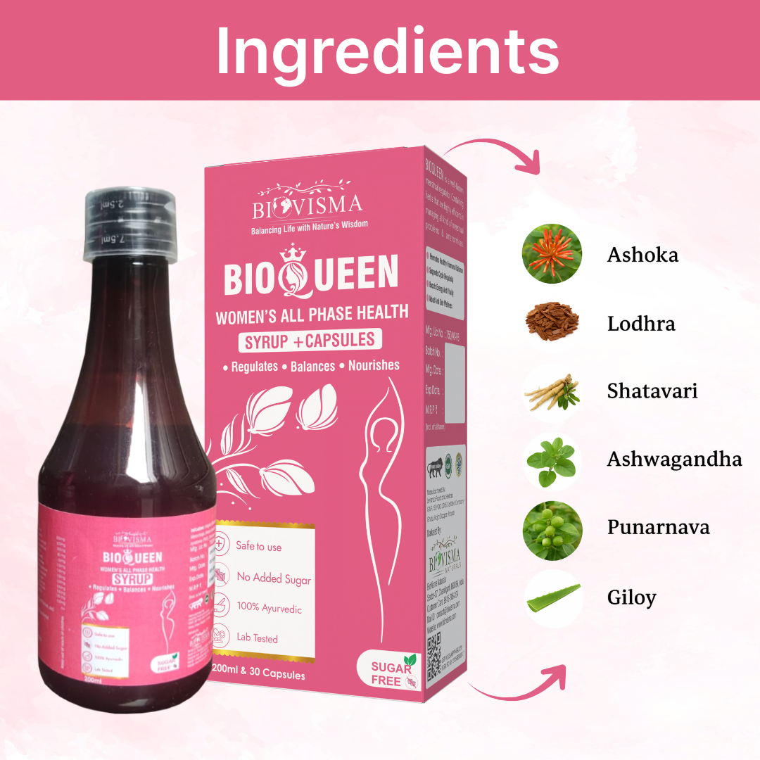 BIOQUEEN Ayurvedic Women’s Wellness Combo | Period Comfort, Cycle Support & Daily Energy | Sugar-Free Syrup 200 ml + 30 Capsules
