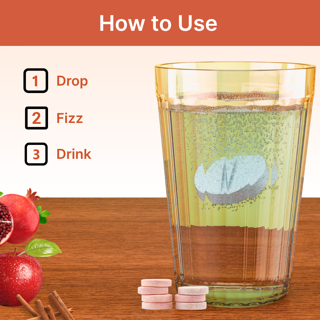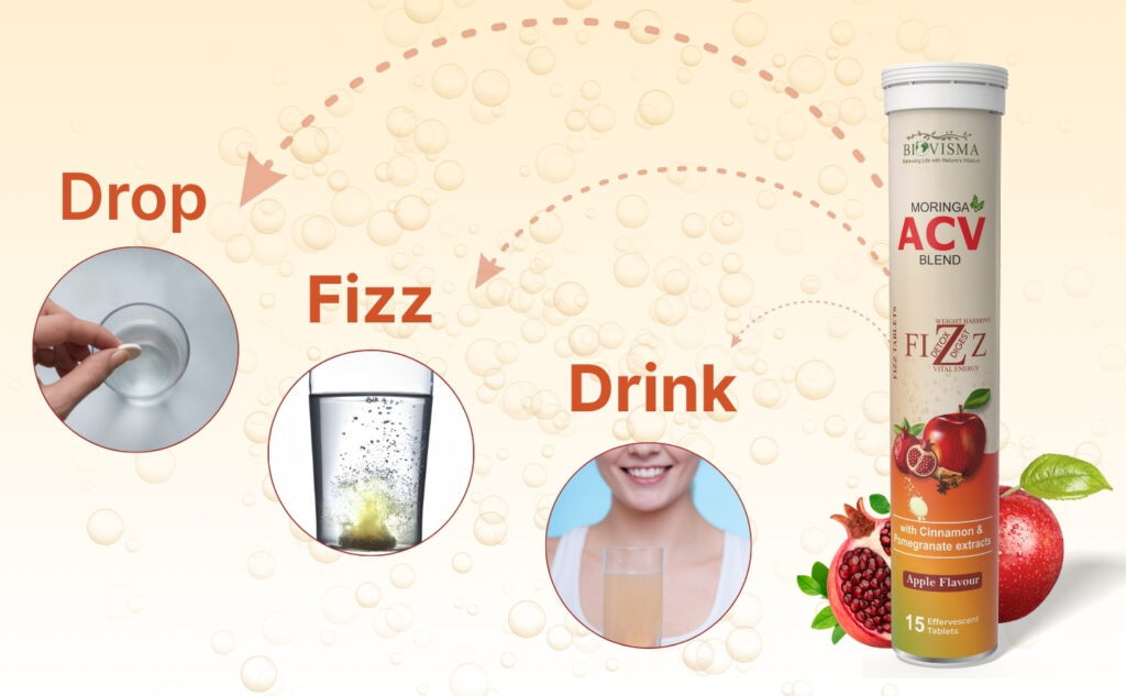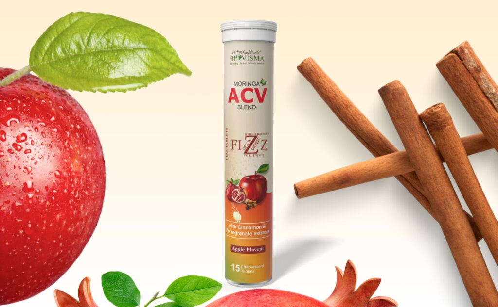 Biovisma ACV Moringa tablets combine Apple Cider Vinegar with Moringa, Cinnamon and Pomegranate extracts to support daily wellness. These apple-flavoured effervescent tablets help manage cravings, maintain energy, and promote an active lifestyle.