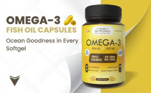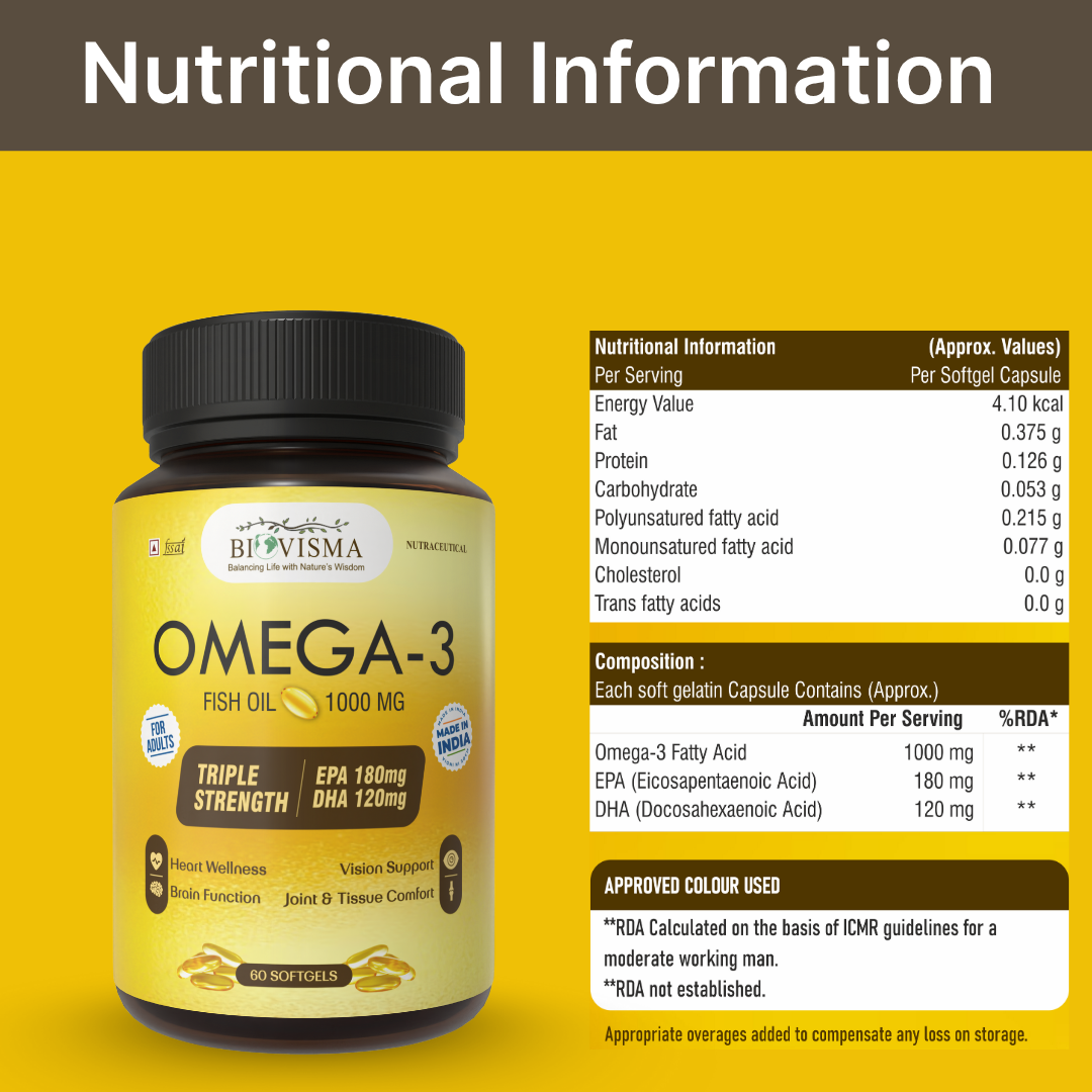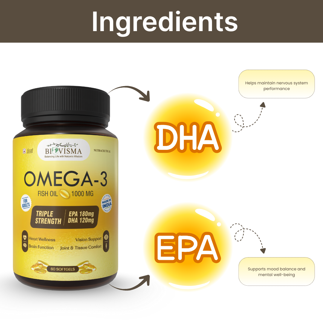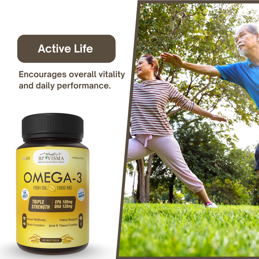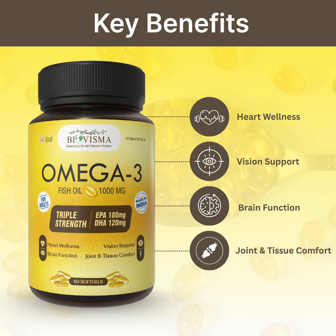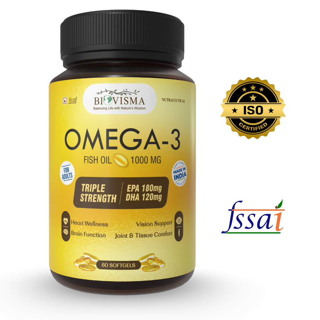 BIOVISMA Omega-3 Fish Oil 1000mg supports heart, brain, eye, and joint health. Each softgel delivers EPA 180mg and DHA 120mg for daily wellness and vitality. Made in India with premium quality standards.